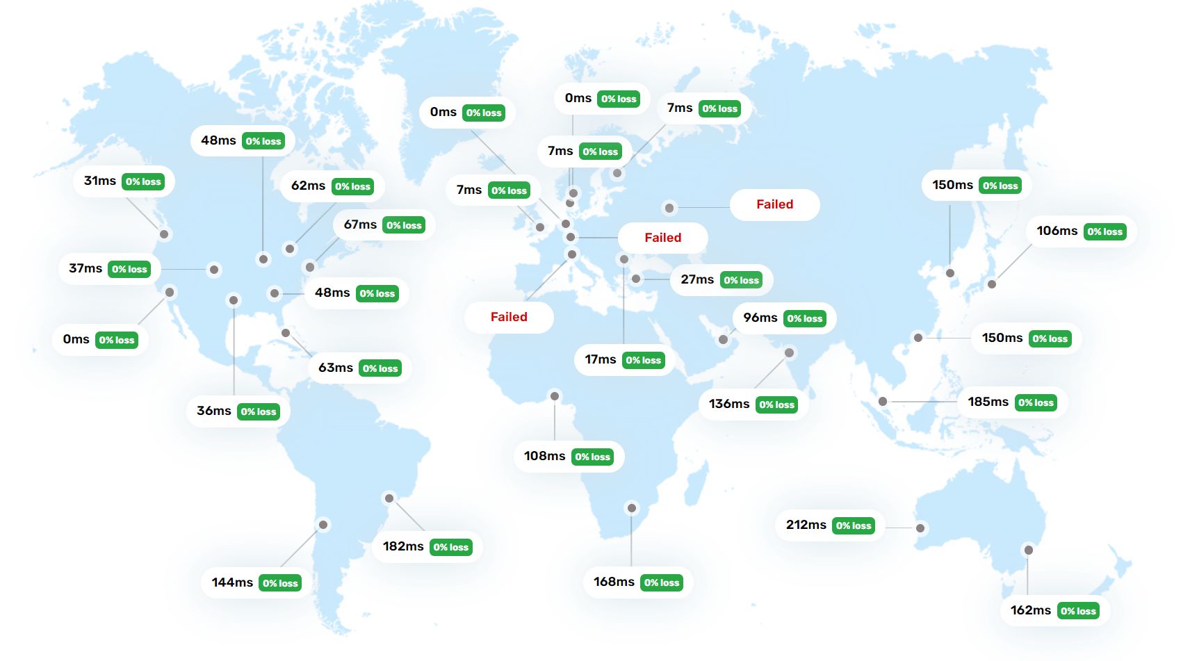 Network Performance Test (Region: Mixed)+---------------------------------------------------------------------------------+| Prot. | Provider | Location | Send | Receive | Latency |+---------------------------------------------------------------------------------+| IPv4 | Airstream | Wisconsin, US | 731.2 Mb/s | 151.2 Mb/s | 130.8 ms || | Uztelecom | Tashkent, UZ | busy | busy | 124.0 ms || | Novogara | Amsterdam, NL | 896.9 Mb/s | 895.8 Mb/s | 28.9 ms || | FiberBy | Copenhagen, DK | 728.1 Mb/s | 607.4 Mb/s | 16.9 ms |+---------------------------------------------------------------------------------+